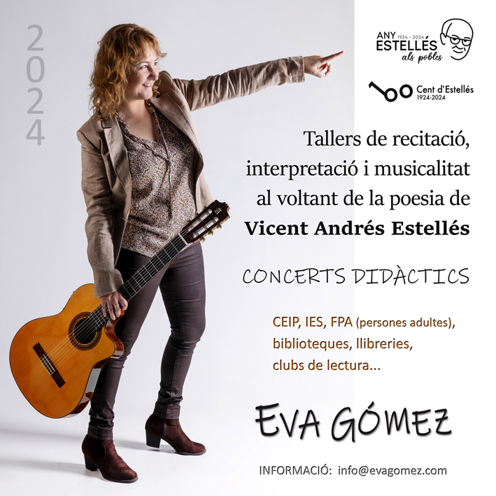 Des de gener de 2024, posem en marxa el concert-recital MUSICANT ESTELLÉS, deu pomes musicats i algunes recitaciones amb acompanyament musical. Aquesta visió de la poesia de Vicent Andrés Estellés també ens ha portat a col·legis i instituts per a oferir tallers de poesia, recitació i musicalitat al voltant de la figura d’Estellés.