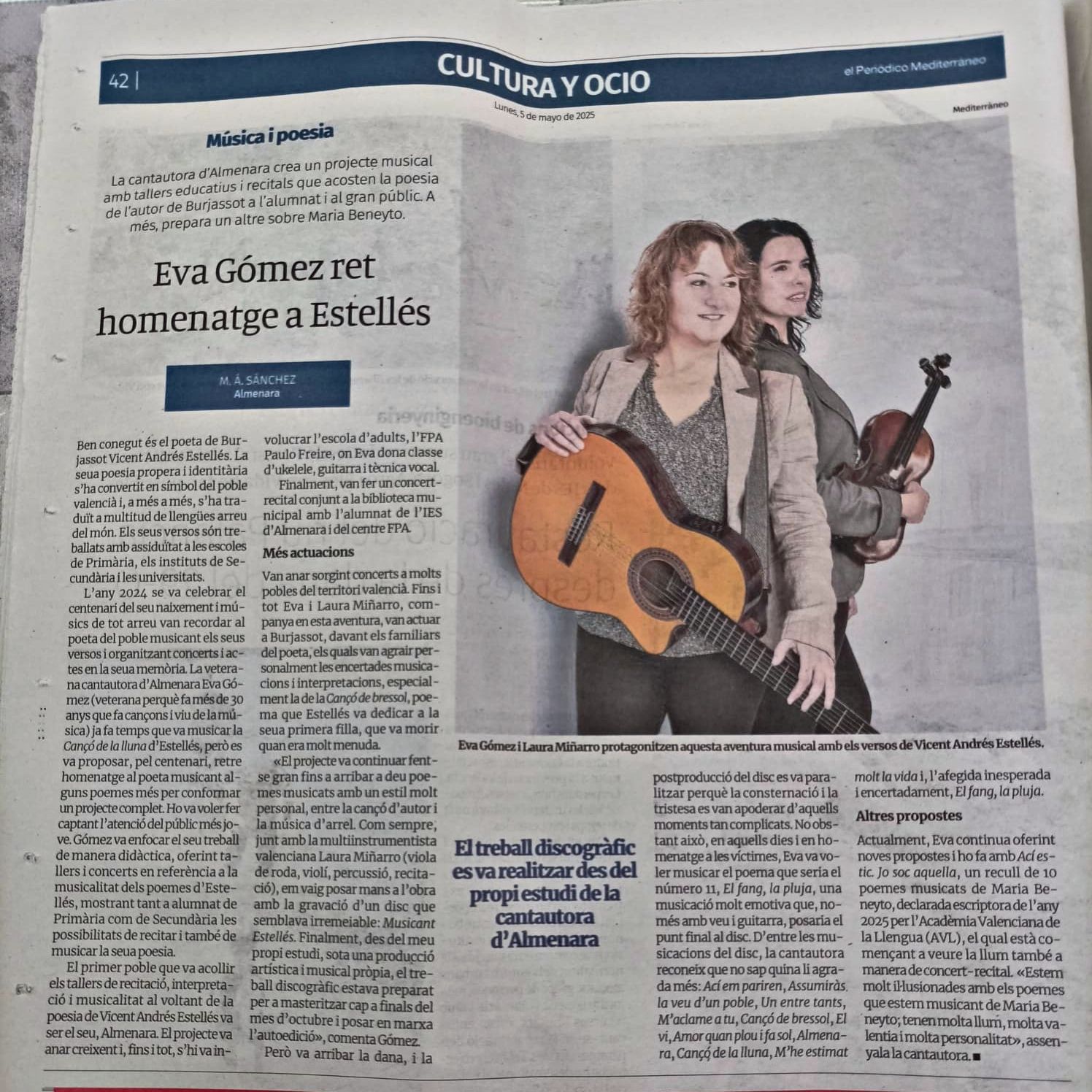 Al següent enllaç podeu escoltar l'entrevista a "L'hora de la cultura", el programa de Reis Juan d'Àpunt Ràdio, per a parlar sobre la preestrena de "Ací estic. Jo soc aquella", els poemes musicats de Maria Beneyto a la sala de concerts del Centre Octubre de València dins del Cicle Amb veu de dona 2025. https://www.apuntmedia.es/programes/l-hora-de-la-cultura/clips/15-10-2025-eva-gomez-musica-veu-dona_135_1821925.html