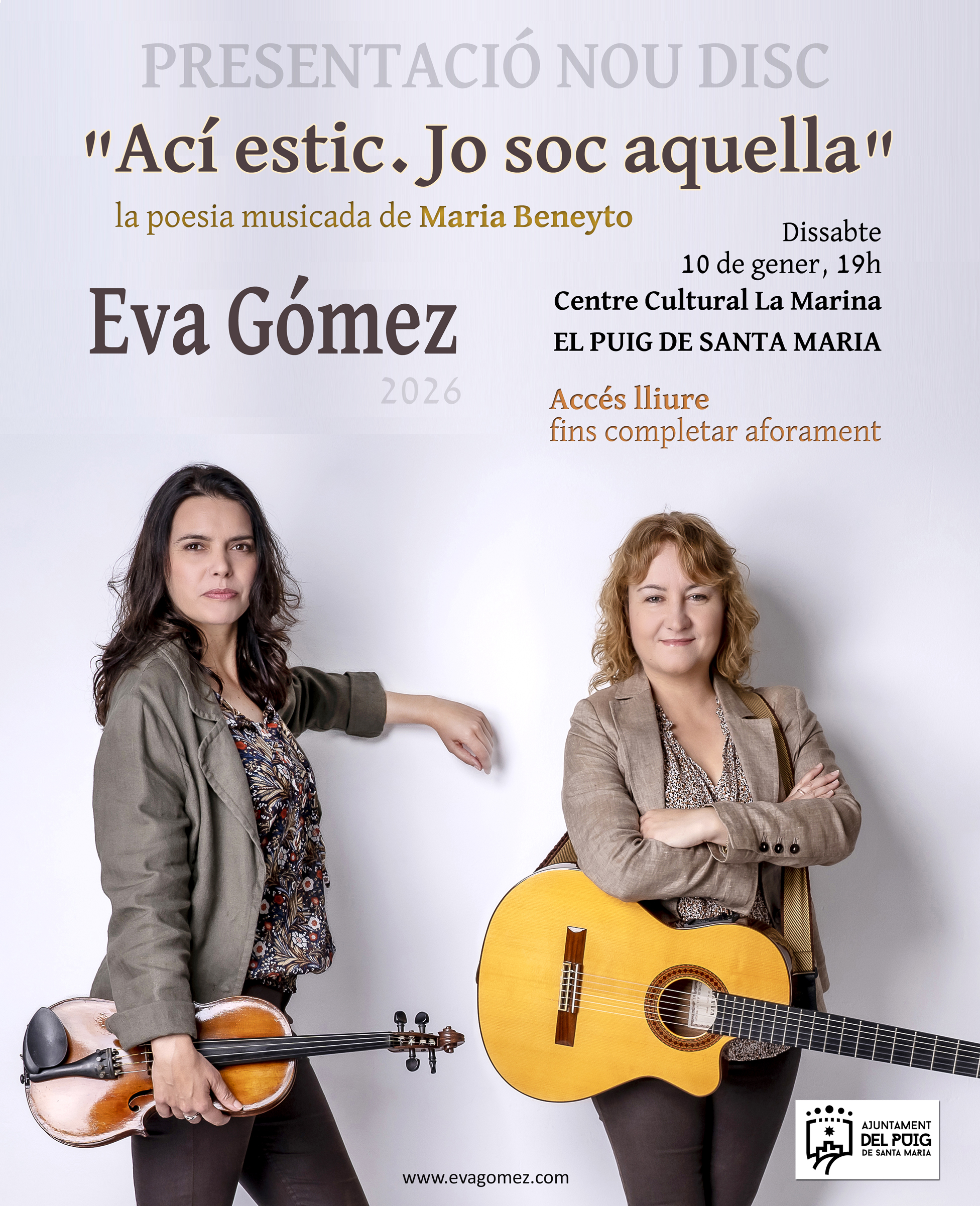 Primera presentació en directe del disc “Ací estic. Jo soc aquella”, la poesia musicada de Maria Beneyto. Serà al poble de El Puig de Santa Maria, al teatre del seu Centre Cultural La Marina. Hi haurà sopreses i molta alegria.
