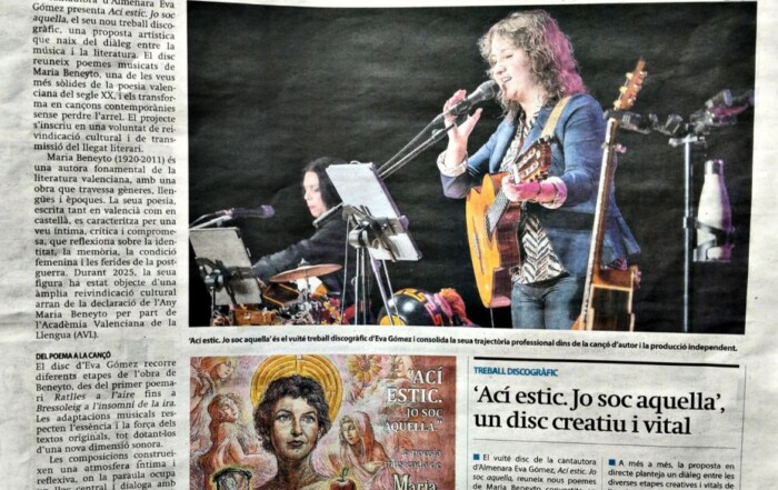 Notícia del nou disc dedicat a Maria Beneyto "Ací estic. Jo soc aquella" al Periódico Mediterráneo de Castelló. Es pot llegir també la notícia en digital al següent enllaç: Eva Gómez transforma els versos de