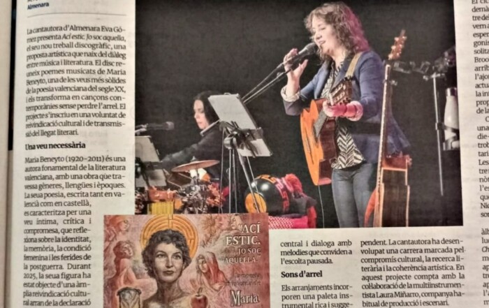 La premsa local també es fa ressò de la publicació i presentació en directe del disc de poemes musicats de Maria Beneyto "Ací estic. Jo soc aquella". Les notícies en paper tenen un encant especial...